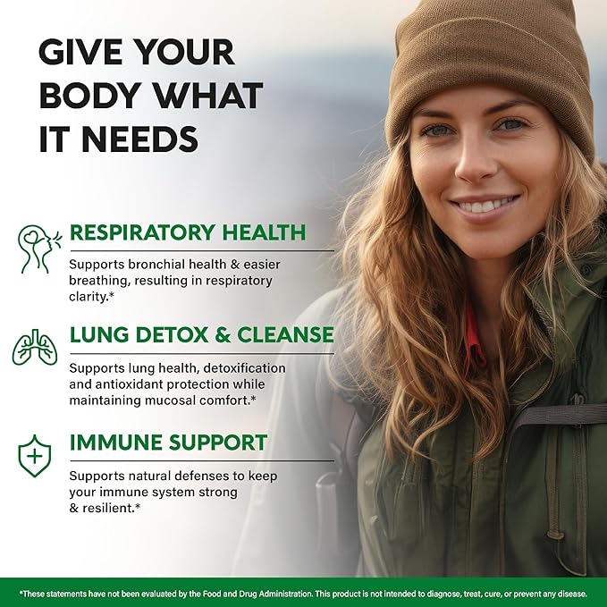 - Antioxidant Herbal Blend — Nurture your lungs with nature's finest herbs and nutrients in our blend. With powerful ingredients like Mullein, Quercetin, Turmeric, Vitamin C, Zinc, Olive Leaf, and Holy Basil it works synergistically to provide essential lung detox, lung cleanse, immune support, lung cleanse for smokers, and respiratory & bronchial health.