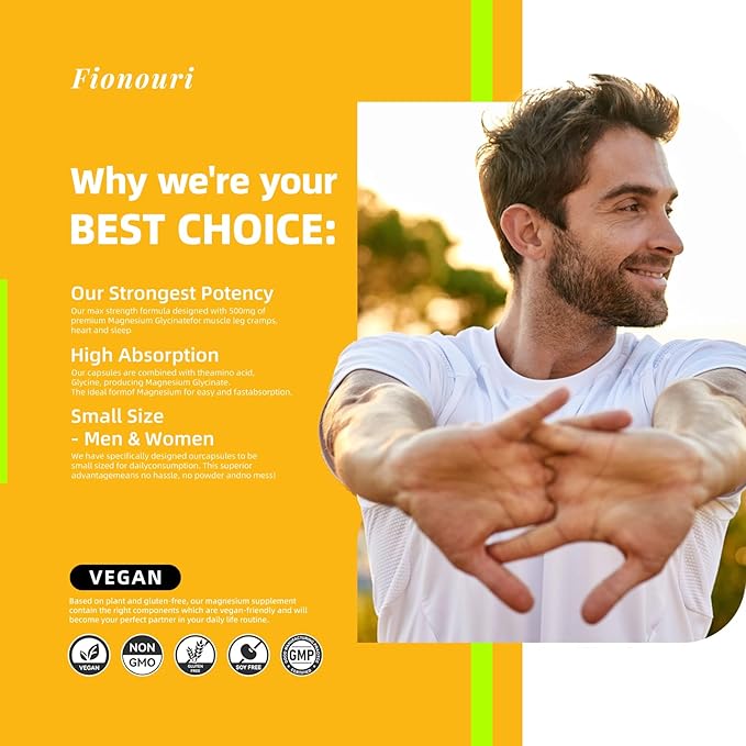 - Natural, Safe, Vegetarian-Friendly Ingredients : Fionouri Magnesium Glycinate Softgels are soy-free, gluten-free, dairy-free, Non-GMO & vegetarian, with no corn, no eggs, no wheat, no tree nuts, no peanuts, no fish/shellfish, no cholesterol, no artificial colors, flavors, binders or fillers.
