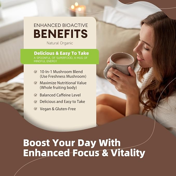 - 【10-IN-1 MUSHROOM POWDER】: Our mushroom coffee powder blend contains 10 premium blend mixes of ingredients such as Lion's mane, Reishi, Cordyceps, Turkey tail mushroom, Chaga, Maitake, Shiitake Mushroom, King Trumpet, Agaricus Blazei, and Willow Bracket. Lions Mane mushrooms powder has lots of nutrients for health, you will find lots of vitamins, calcium, and potassium. Mushroom powder coffee alternative is non-GMO, gluten-free ingredients.