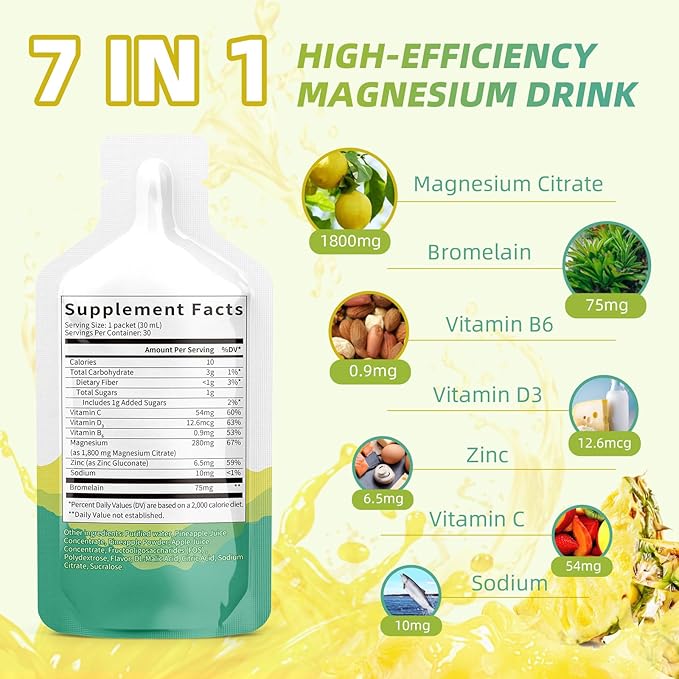 - Magnesium Citrate Nutrient Blend: Each 1 Fl Oz packet of this Magnesium Citrate Supplement delivers a potent blend of essential nutrients, including Magnesium Citrate, Bromelain, Vitamin C, Vitamin D3, Vitamin B6, Zinc, and Sodium. Every ingredient is carefully selected to enhance your overall well-being.