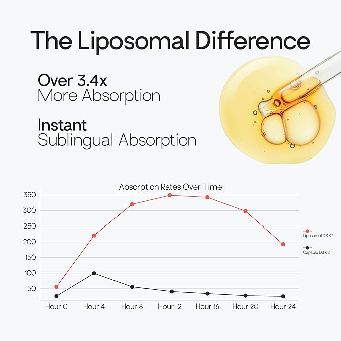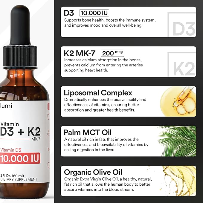- HIGH STRENGTH: Just one serving provides 250mcg (10000IUs) of D3 & 200 mcg of Vitamin K2 (as MK7, the form of K2 with the highest bioavailability). Strengthened with MCT Oil and a Liposomal Absorption Complex.