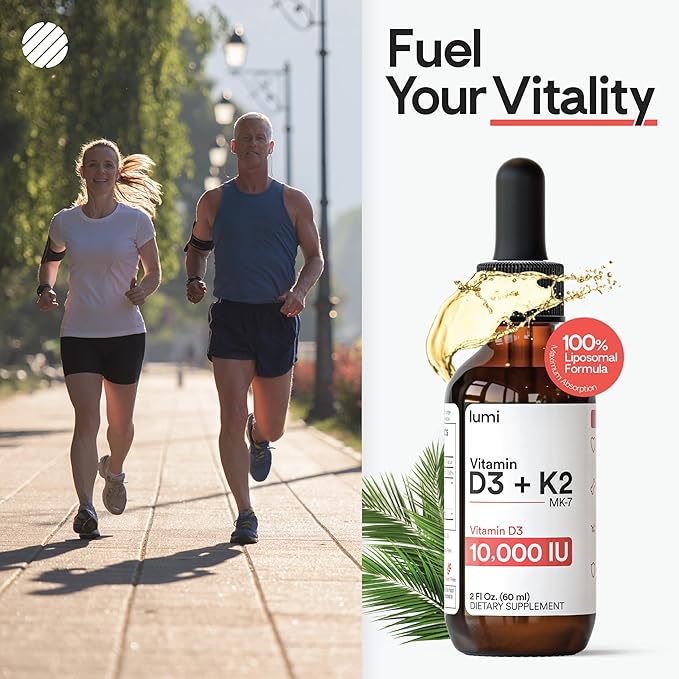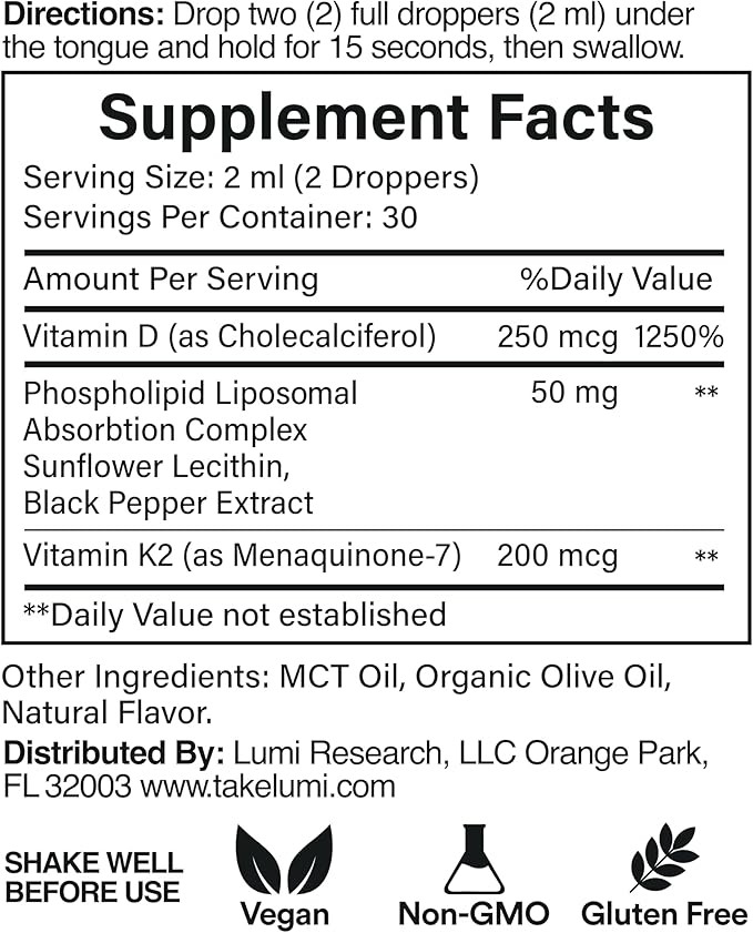 lumi Vitamin D3 K2 MK7 w Palm MCT Oil - 10000 IU D3, 200 mcg K2 MK7-60ml Liposomal Absorption Sublingual Liquid Drops - Non-GMO, Vegan, Unflavored Liquid - Monthly Supply - 2 Fl Oz