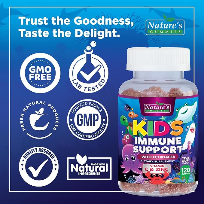 - KIDS IMMUNE SUPPORT VITAMINS: Nature's Gummies best children's echinacea plus zinc kids immunity gummy support with vit c dietary supplements chewable berry flavor gluten free non gmo child cough count kid daily booster childrens vitamin elderberry supplement equinacea cherry iron multi children multivitamin methylated multivitamins natural omega 3 system baby toddlers usda vegan defense boost edelberry sambucus syrup vitamina vitaminas para niños 42 50 60 builder natures nutrition teens toddler ages 4 year old probiotic probiotics gomitas gummie liquid elberry