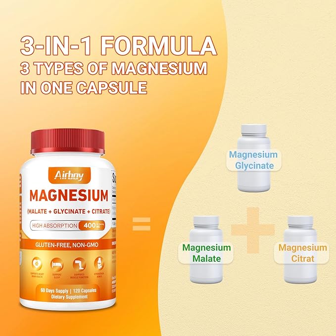 Airboy Magnesium Mineral Supplements Triple Magnesium Complex Supplement, 400mg of Magnesium Glycinate, Malate, Citrat, High Absorption Support Sleep, Muscle, and Relaxation,120 Vegan Capsules