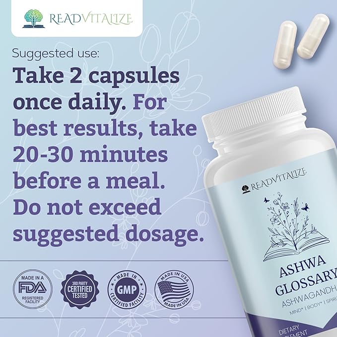 - 𝗖𝗼𝗻𝘃𝗲𝗻𝗶𝗲𝗻𝘁 𝗮𝗻𝗱 𝗘𝗮𝘀𝘆 𝘁𝗼 𝗨𝘀𝗲 - Incorporate Ashwa Glossary into your daily routine with ease. Our vegan vitamins contain high-quality ashwagandha root extract, supporting overall well-being and hormonal balance, enhancing mood, supporting stress management and better sleep. It’s an essential addition for any book lover's life.*