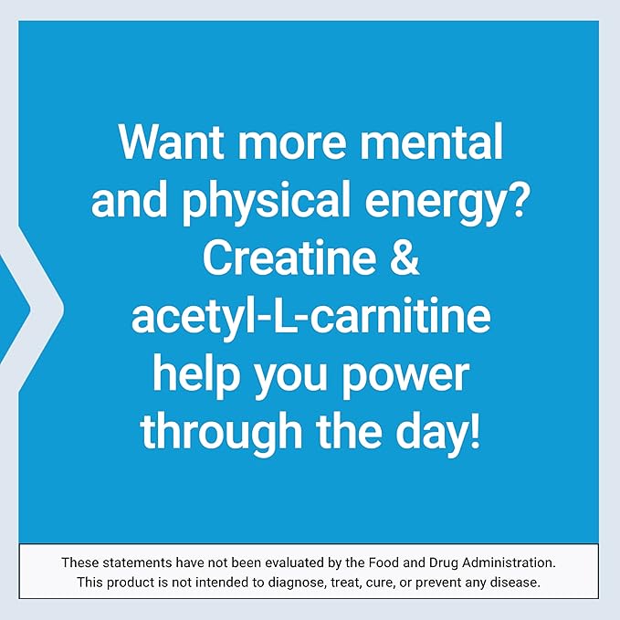 - Mind and body energy – Both creatine and acetyl-L-carnitine help produce energy at the cellular level. Because of this, these clinically studied nutrients help combat general physical and mental fatigue.