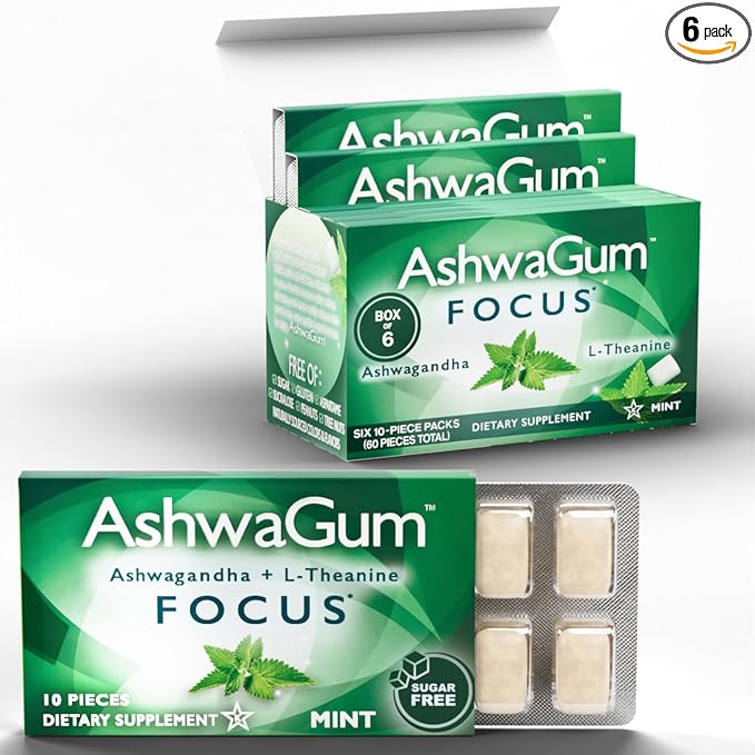 - CONVENIENT AND FUN: Chewing gum itself can help you focus, and AshwaGum takes it a step further by combining this natural stress-busting action with powerful ingredients that support improved cognition.