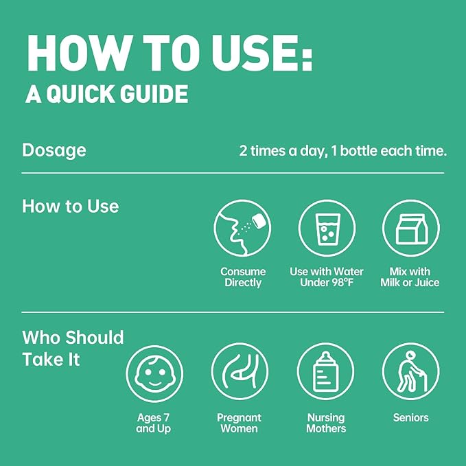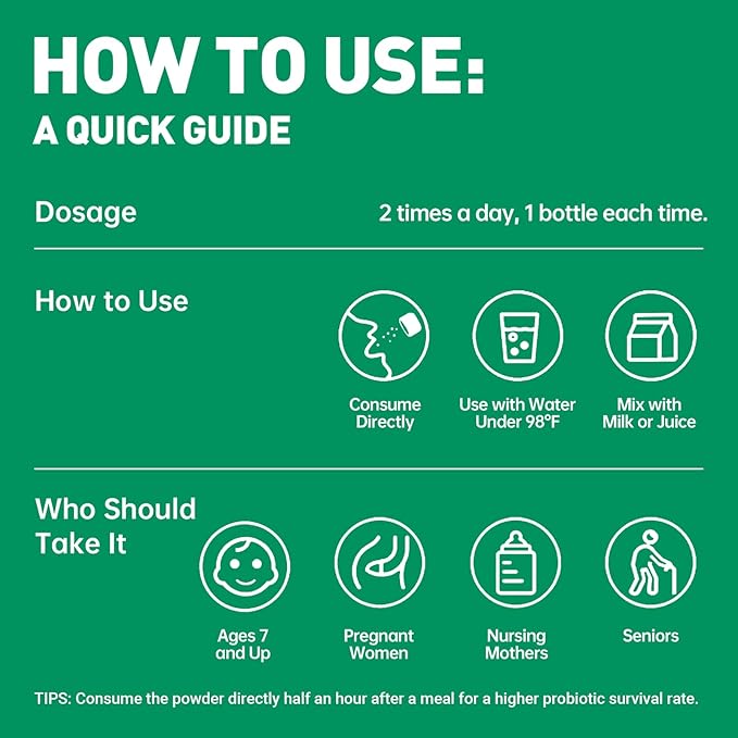 - Daily Use: Break open the green bottle i, peel off the aluminum film, and pour the probiotic powder directly into your mouth. Swallow with water for easy consumption. For optimal results, consume half an hour after a meal to enhance probiotic survival rates. Alternatively, mix with milk or juice for a more palatable experien
