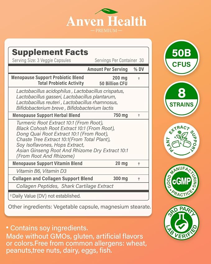Menopause Supplements for Women - Probiotics for Menopause Relief, Hot Flashes, Night Sweats, Bloating & Gut Health with Herbs, Collagen, Vitamins, Gluten Free & Non-GMO | 90 Veggie Caps