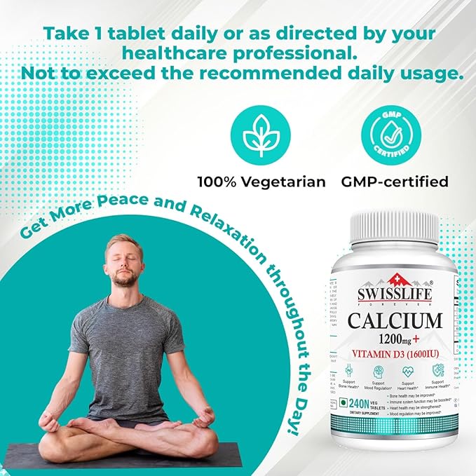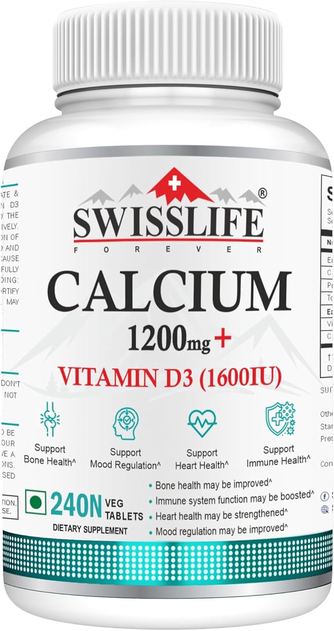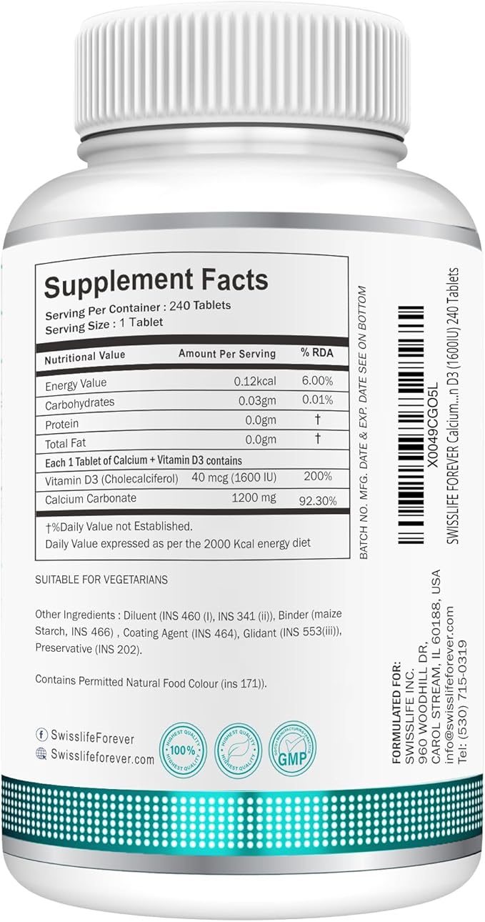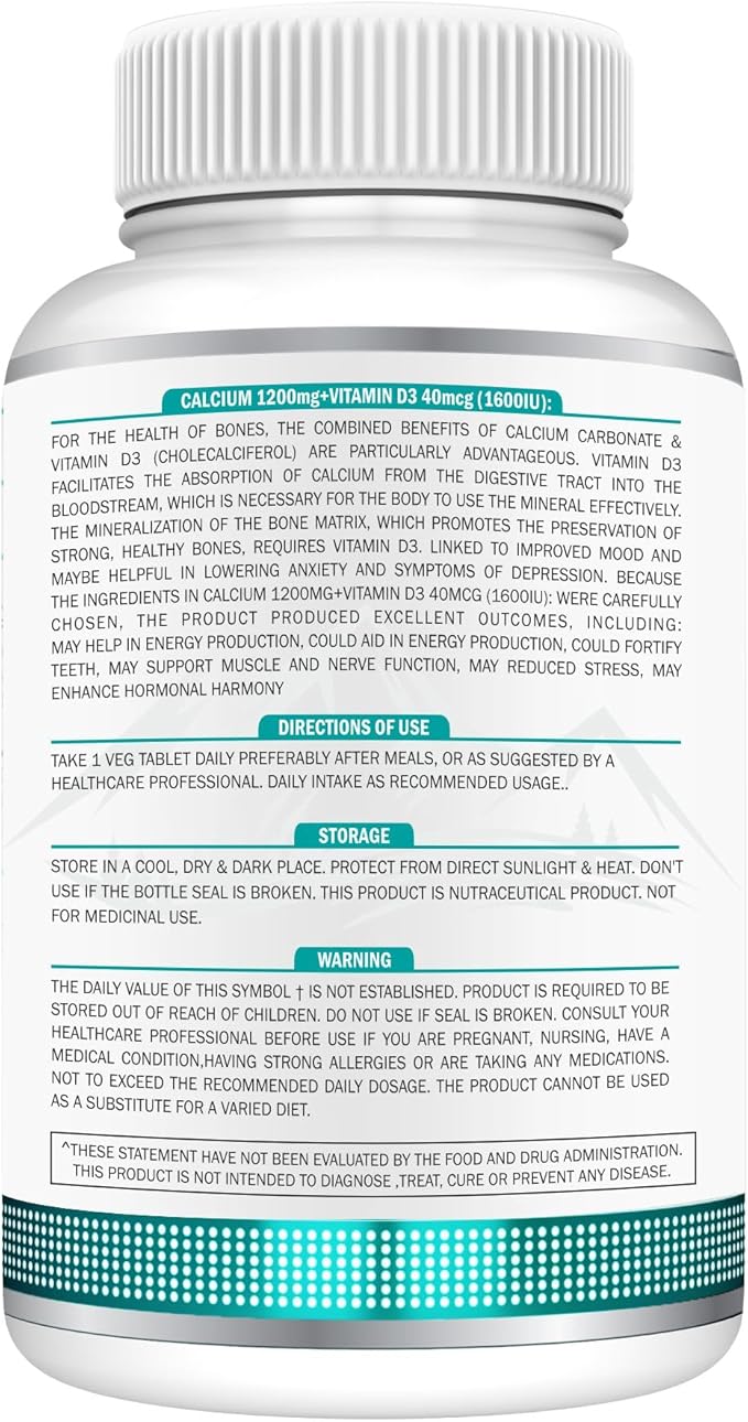 Calcium Carbonate 240 Tablets 1200mg | with Vitamin D3 1600IU| Dietary Tablets with Mineral and Vitamins Help in Bone Health, Muscle Health, Joints Health for Men & Women