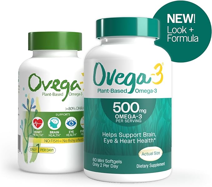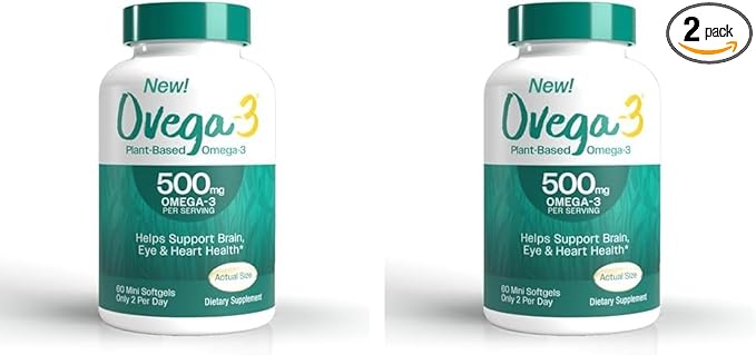 OVEGA-3 Plant-Based Omega-3 from Algal Oil Daily Supplement, 500mg, Supports Brain, Eye & Heart Health, Two Mini softgels per Day, 60 Count (Pack of 2)