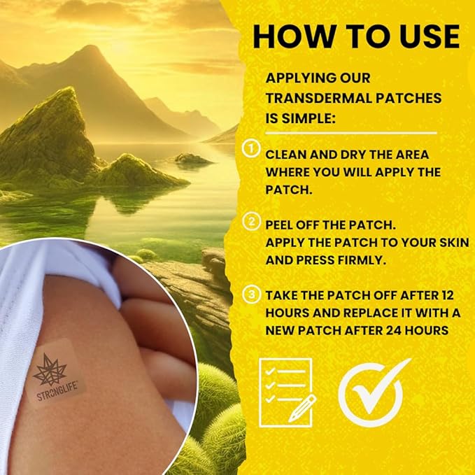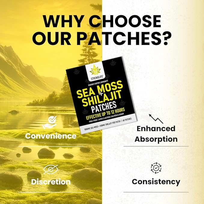 - Shilajit (500mg) and Sea Moss (1000mg) patches support natural energy production and stamina, promoting vitality throughout the day.