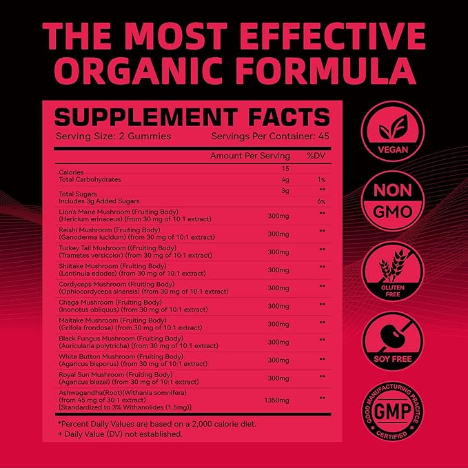 - [Cordyceps & Ashwagandha] - We also decided to enhance the adaptogenic (aka helping you to adapt to new conditions) qualities of your mushroom gummies, that's why we also added ashwagandha to the mix. This herb among the other mushrooms in our blend will help you stay calm, focused, and healthy in a face of everything life may throw at you.