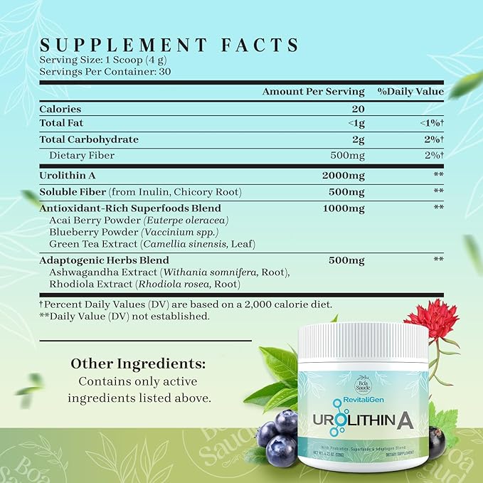 - For Best Results: This Urolithin A+ supplement includes Acai Berry Powder, Blueberry Powder, Green Tea Extract, and Prebiotics, designed to complement the effects of Urolithin A for an enhanced experience