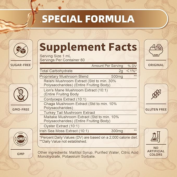 - Special Ingredients : Lion's Mane, Chaga, Reishi, and Cordyceps, Turkey Tail, Maitake mushroom, irish sea moss