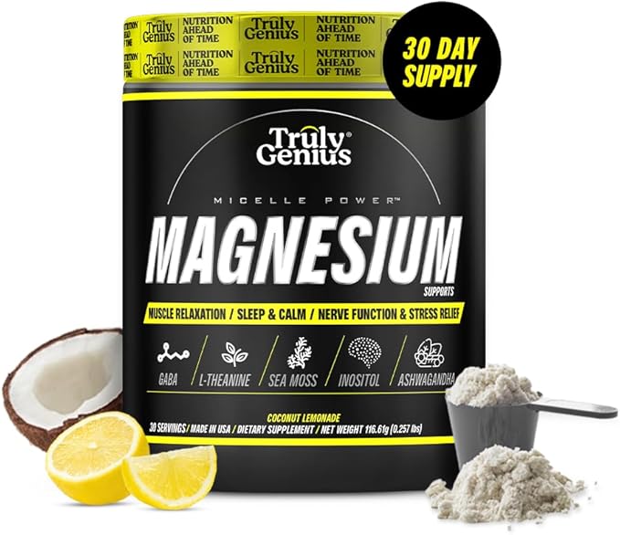 - [BENEFITS AT A GLANCE] Unlock the secret to restful nights, good sleep and energized mornings with Truly Genius Magnesium. Our unique formula, featuring Micelle Power Technology for unmatched absorption, combines essential nutrients and healthy fats to support deep sleep and vitality. With natural coconut lemonade flavor and the recommendation of athletes like James Rodriguez, this supplement is your ally in achieving balanced recovery and rejuvenation.