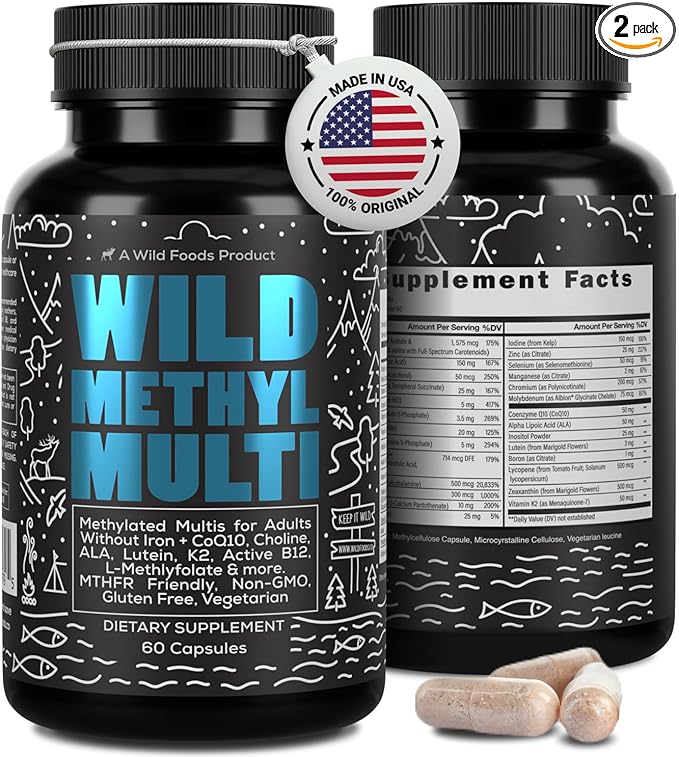 Wild Methylated Multivitamin for Women & Men | Daily Multi Vitamin | MTHFR Supplement Without Iron | Methylated B12, Folate, Vitamin C, A, K2, D, E, Choline, Biotin, ALA, CoQ10 & More (Pack of Two)