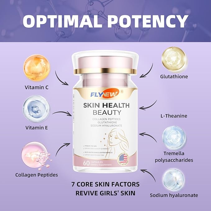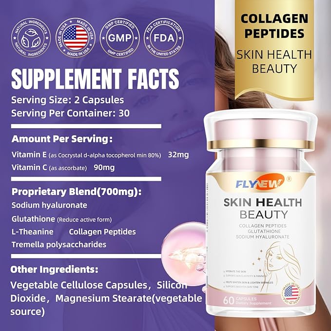 - Discover Radiant Beauty: Women's Beauty Supplement, uniquely formulated to rejuvenate your skin and renew your natural beauty. Each tablet contains generous doses of Tremella polysaccharides 25mg, Sodium Hyaluronate 100mg, Taurine 100mg, Glutathione 100mg, Vitamin C 45mg, Collagen Peptieds 50mg, and Vitamin E 16mg.