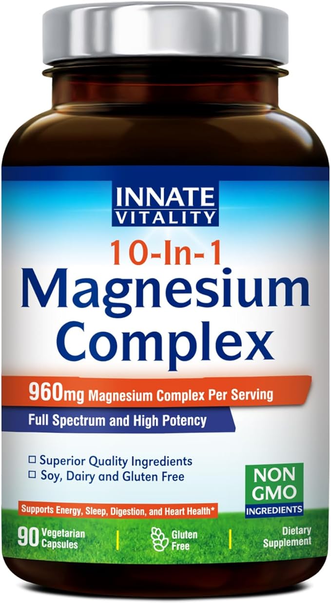 - [100% Natural, Safe, Vegetarian-Friendly Ingredients] Innate Vitality 10-In-1 Magnesium Complex is soy-free, gluten-free, dairy-free, Non-GMO & vegetarian, with no corn, no eggs, no wheat, no tree nuts, no peanuts, no fish/shellfish, no cholesterol, no artificial colors, flavors, binders or fillers. Our ingredients are also Kosher and Halal certified.