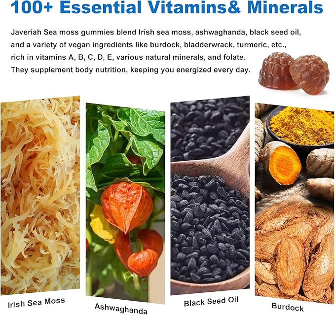 - 13 in 1 Superfood Gummies : Javeriah Sea moss gummies are packed with over 100 essential vitamins and minerals plus an immunity blend to increase nutrient absorption by 50%. Our 100% vegan superfood gummies are a perfect combination of natural ingredients including Irish Sea Moss,Black Seed Oil, Ashwagandha, etc. 13-in-1 sugar-free gummies are a healthier alternative to traditional gummies.