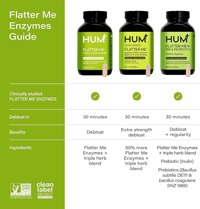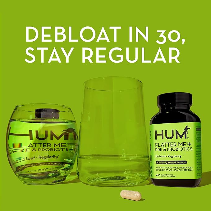 HUM Flatter Me Digestive Enzymes with Probiotics & Prebiotics - Fast-Acting Bloat Relief, Digestive Health and Regularity, Vegan Formula 60 Servings
