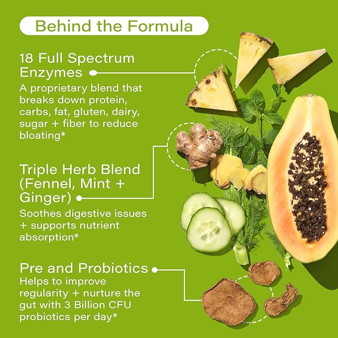 - Fast-acting, Debloat & Regularity Formula–– Bloating relief in just 30 minutes with our blend of 18 full-spectrum digestive enzymes, plus pre and probiotics to promote regularity.