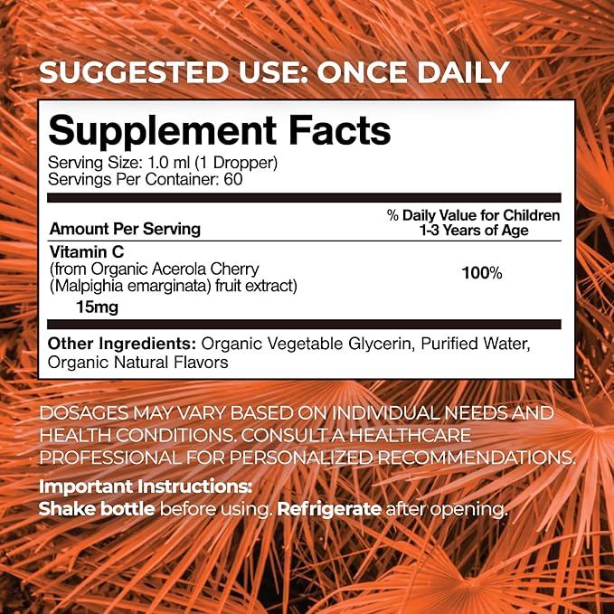 - Tropical Oasis Organic Vitamin C Drops for Toddlers — Support your growing toddler’s immune system with our organic Vitamin C liquid drops. Since the body can't produce Vitamin C naturally, it's essential to get it from outside sources. Our Vitamin C is derived from organic acerola fruit extract, which is known to have higher Vitamin C content than typical citrus fruits.