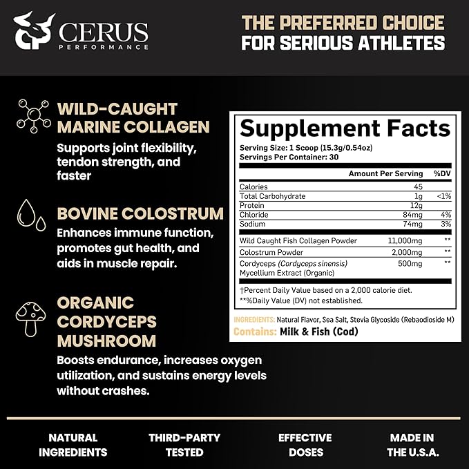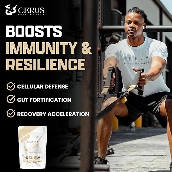 - Elite Ingredients for Optimal Results RENEW features a potent blend of 11g Wild-Caught Marine Collagen for supporting joint, ligament, and tendon health, 2g Bovine Colostrum to boost immune and gut health, and 500mg Organic Cordyceps Mushroom for increased energy and stamina. Our advanced formula ensures you get the best support for your demanding workouts and recovery.