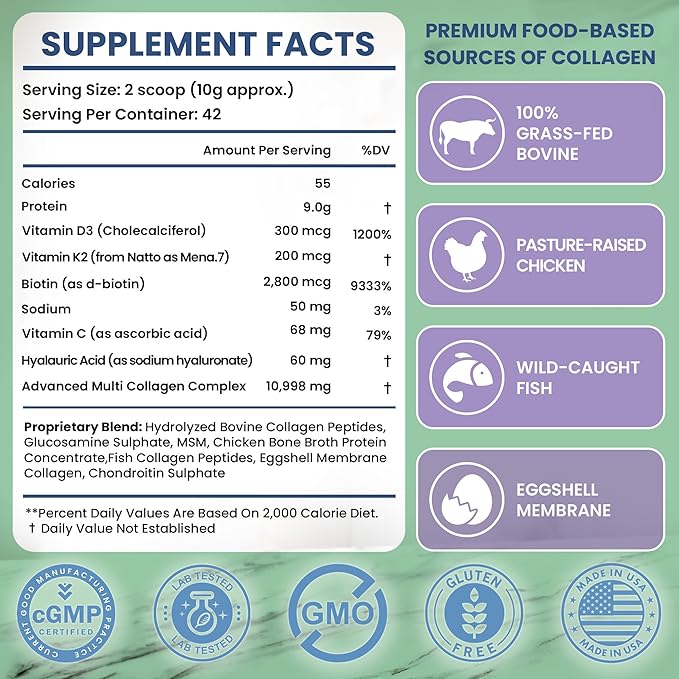 8in1 Advanced Multi Collagen Peptides, 16 Oz - Hydrolyzed Protein | Type I, II, III, V, X with Vitamin D3 & K2, Hyaluronic Acid, Biotin, Vitamin C, MSM, Glucosamine Sulphate & Chondroitin - Unflavored