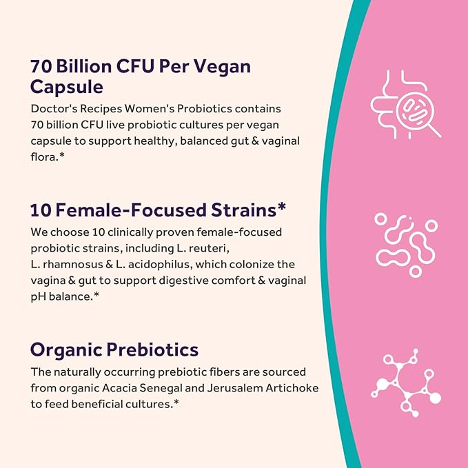 Doctor's Recipes Probiotics for Women, Organic Prebiotics and Probiotics for Digestive Health, Vaginal Health, 70 Billion CFU, 10 Strains, Shelf Stable, 30 Capsules