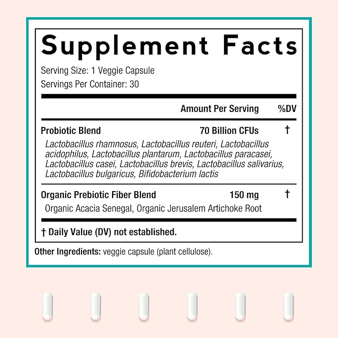 - Organic Prebiotics and Probiotics: Doctor’s Recipes Women's Probiotics contains 70 billion CFU, 10 gynecologist-recommended, clinically proven probiotic strains (including L. reuteri & L. acidophilus), colonizing in your gut and vagina to support healthy flora.* This vaginal probiotics also contains 150 mg of naturally occurring prebiotics from organic Acacia Senegal and organic Jerusalem Artichoke Root, two of the best soluble fibers that fuel beneficial culture growth.*