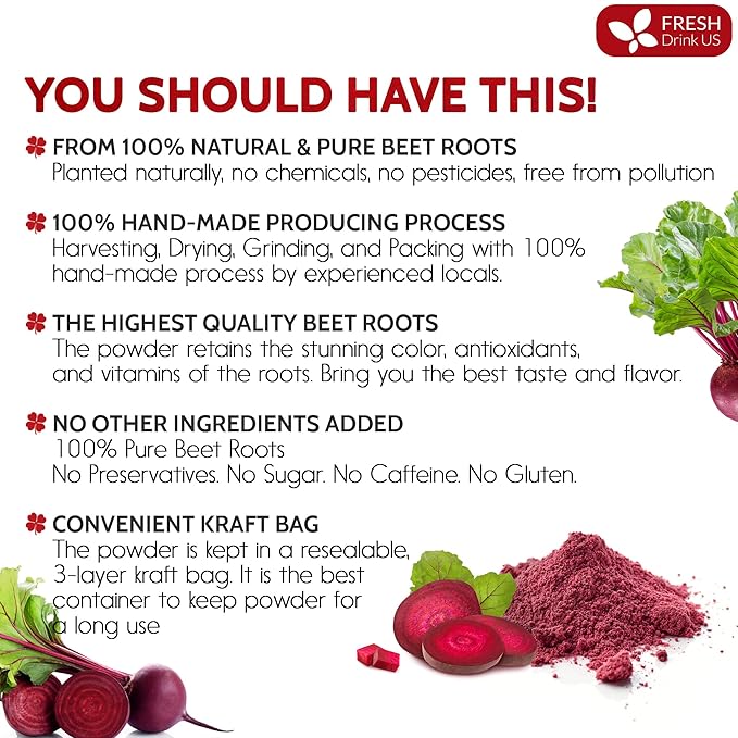 - ☘️ A SUSTAINABLE FARMING TO SUPPORT COMMUNITY: Our experienced farmers adopt methods that minimize the environmental impact of agriculture. We follow strict international standards with No Pesticides or Herbicides used on the roots. By consuming these Beet Root Powder, you are contributing to the long-term well-being of both people and the planet.