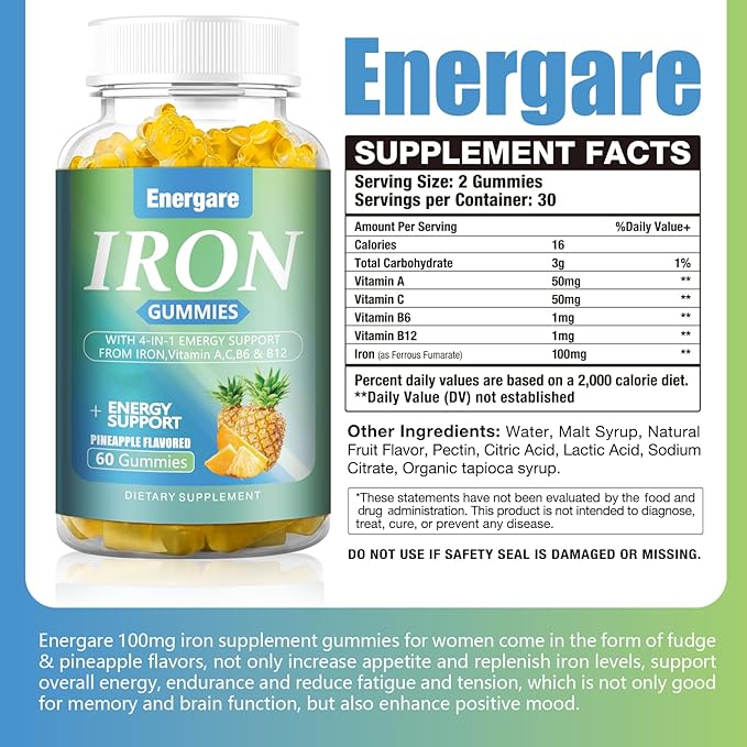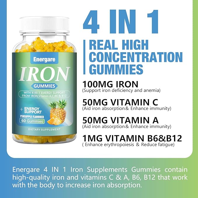 - 4 IN 1 Iron Supplements Gummies: Energare 100Mg Iron Supplement Gummy contains high-quality iron and vitamins C&A,B6,B12 that work with the body to increase iron absorption. Promoting the growth of red blood cells, and also help your body increases energy, decreases fatigue & immune system health. A variety of vitamins can effectively help us enhance energy supplement, B6 and B12 combination can help us reduce fatigue, improve attention, enhance immunity, increase sleep.