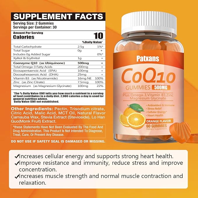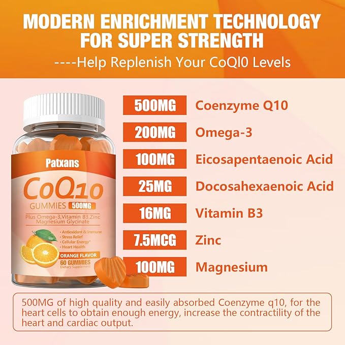 - Why Choose Patxans : Each Patxans CoQ10 gummies contains 500mg coenzyme Q10,200mg total omega-3 fatty acids,100mg Eicosapentaenoic Acid ,25mg Docosahexaenoic Acid,16mg vitamin B3,7.5mcg zinc,100mg magnesium,are an easy to take gummy suitable for women,men&,adult.Patxans supplements gummies are gluten-free, gelatine-free.And it's pectin-based.You can incorporate them into your daily life.