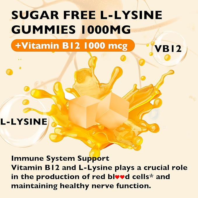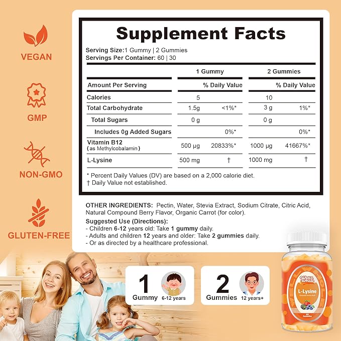 L-Lysine Gummies 1000mg - L-Lysine Supplements for Kids and Adults - Lip and Cold Sore* Support for Women - Chewable Lysine Gummies with Vitamin B12 - Vegan, Non GMO, Gluten-Free, 120 Counts