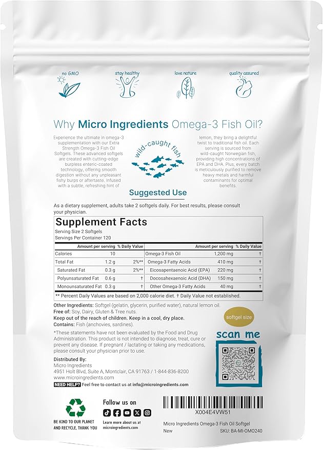 - Micro Ingredients offers extra strength 1,200mg omega-3 fish oil softgels. Infused with a sweet lemon flavor and made with burpless enteric coated technology. Retains essential EPA DHA levels from wild-caught Norwegian fresh fish.