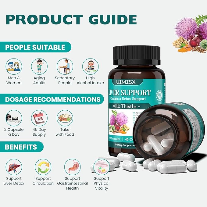 - Advanced Liver Support &Liver Detox Complex - Most liver health supplements use milk thistle extract for its liver health support. After a long period of clinical research, we UIMISX developed a complex formula containing 9 ingredients, containing high concentrations of milk thistle extract and other herbal ingredients, which greatly improved the absorption and utilization rate of milk thistle.