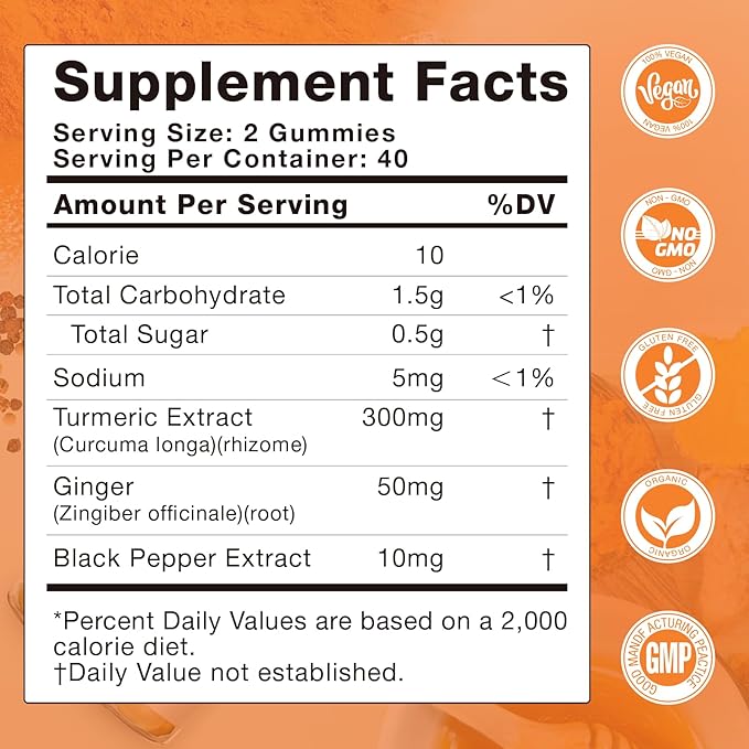 - Great Tasting Turmeric Gummies: Enjoy all the benefits of turmeric in a delicious gummy with orange flavor. NO glucose syrup is used for sweetening our curcumin supplements. Our low sugar turmeric curcumin gummies ensure you can enjoy your turmeric ginger gummies without worry.