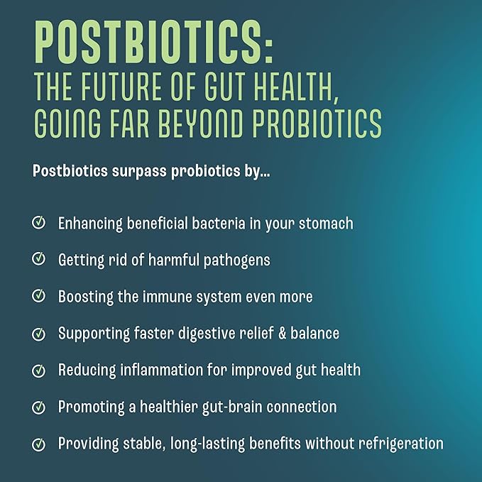 - The Future of Complete Gut Health - Our postbiotics for gut health go beyond traditional probiotics by offering unparalleled stability, efficacy, and bioavailability. These bioactive compounds enhance beneficial gut bacteria while getting rid of harmful pathogens in your body, promoting microbiome harmony. With antimicrobial, antioxidant, and immune-boosting properties, postbiotics introduce a revolutionary era in digestive wellness