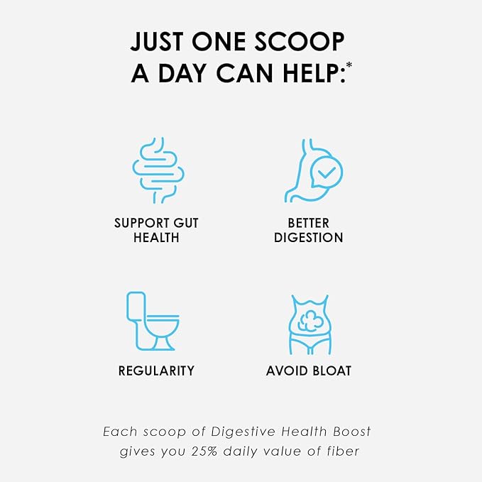 - PROMOTE DIGESTIVE COMFORT: Digestive Health Boost is engineered to support your digestive health by alleviating bloating and irregularity with a potent blend of soluble and insoluble fibers. Incorporating chicory root and pea fiber, it maintains your digestive regularity, ensuring you feel light and comfortable throughout the day.