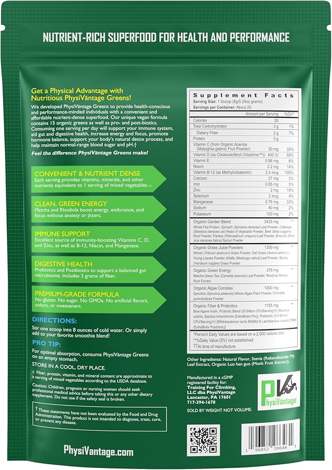 - NATURAL ENERGY BOOST: Matcha and Rhodiola provide clean, green energy, endurance, and enhanced focus without jitters or a “crash”. No matter if your “mountain” for the day is at home, the office, the gym, or in sports competition, PhysiVantage Greens will provide a natural lift you will feel!