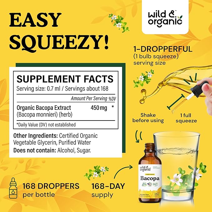 - 168-Day Supply: Each 4 fl. oz. bottle of Wild & Organic drops with bacopa powder contains 168 servings per bottle, providing a 168-day supply when taken one time per day.