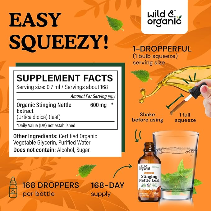 - 168-Day Supply: Each 4 fl. oz. bottle of Wild & Organic stinging nettle powder based drops contains 168 servings per bottle, providing a 168-day supply when taken once per day.