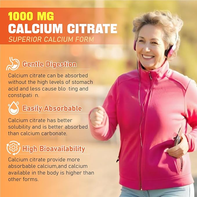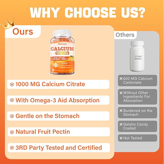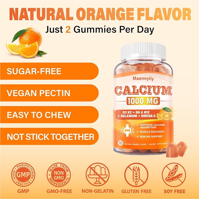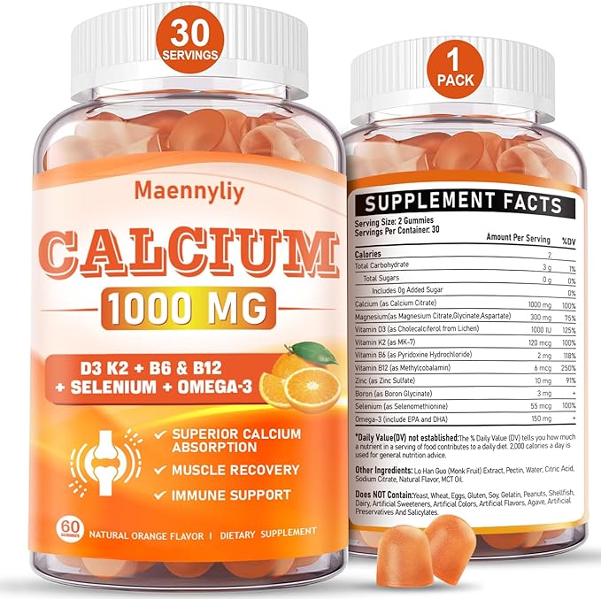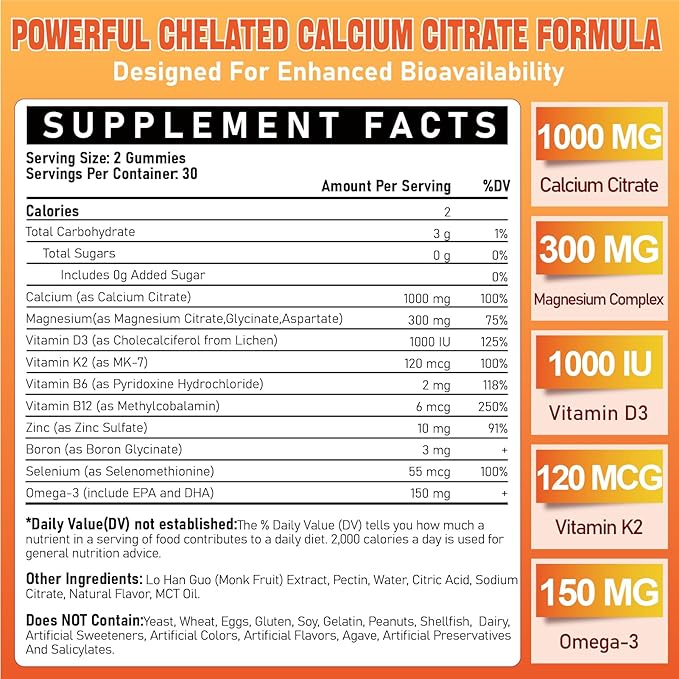 - SUPERIOR ABSORPTION & BIOAVAILABILITY: Crafted with precision, our calcium supplement features 1000 mg Calcium, Magnesium, D3, K2, B6, B12, Zinc, Boron, Selenium, and Omega-3. Calcium is presented as chelated Calcium Citrate, GENTLE ON THE STOMACH and more easily absorbed than calcium carbonate. Enhanced with Omega-3, it boosts calcium uptake, improving bioavailability, b0ne density, and teet h health. Each bottle offers a 30-day supply, with 2 calcium gummies daily to meet your calcium needs.