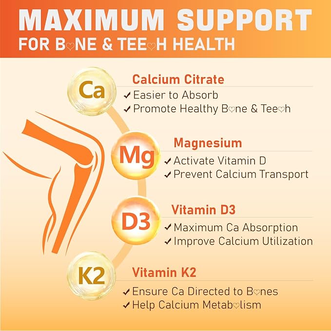 - FORTIFY B0NE & TEET H & MUSCLE: Experience targeted ingredients with our calcium magnesium supplement! D3 aids calcium absorption, supporting b0ne and teet h health. K2 prevents calcium deposition in arter ies, ensuring stored in b0nes and teet h. The synergy of D3 and K2 enhances b0ne strength. Calcium, Magnesium, and Boron regulate calcium metab0lism, rela x muscles. Plus, selenium has antioxidant to protect b0ne and muscle, reducing inflammati0n and improving overall b0ne health.