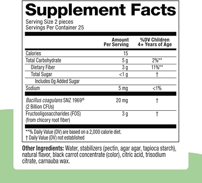 - Prebiotic Fiber: Includes 3g of chicory root prebiotic fiber (FOS) to promote regular bowel movements and support a healthy gut microbiome*, especially helpful for children with low fiber intake.