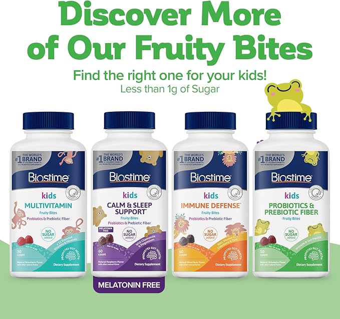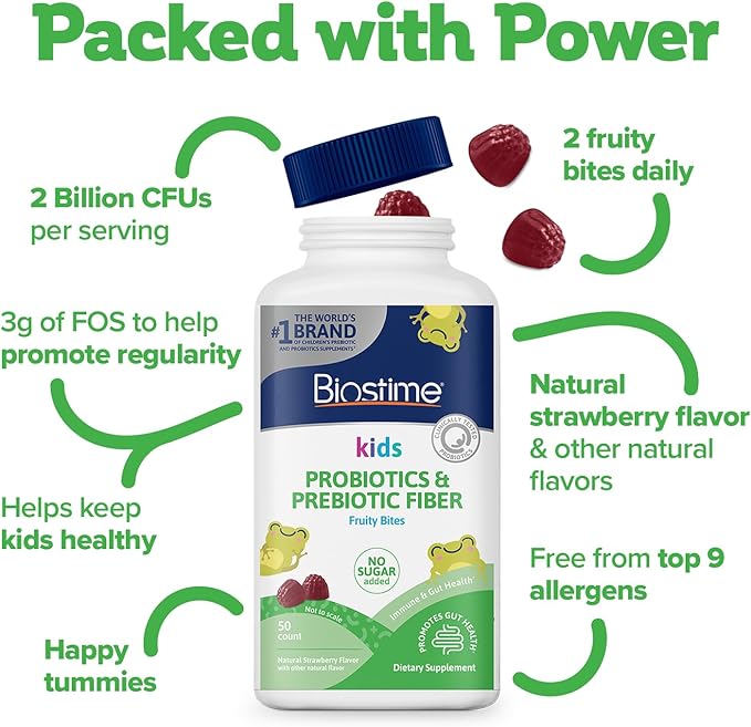 Biostime Kids Prebiotic & Probiotic Gummies (Ages 4+) | Probiotics for Kids | Includes 2 Billion CFU to Support Digestive Health| No added sugar Fruity Bites | Free from Top 9 Allergens |50 Count