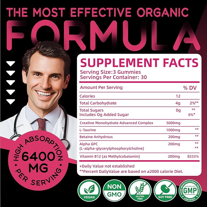 - 90 gummies (30 Servings) of Creatine Monohydrate Per Bottle