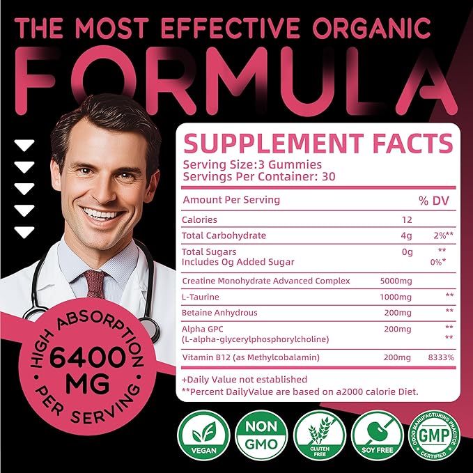 - 90 gummies (30 Servings) of Creatine Monohydrate Per Bottle