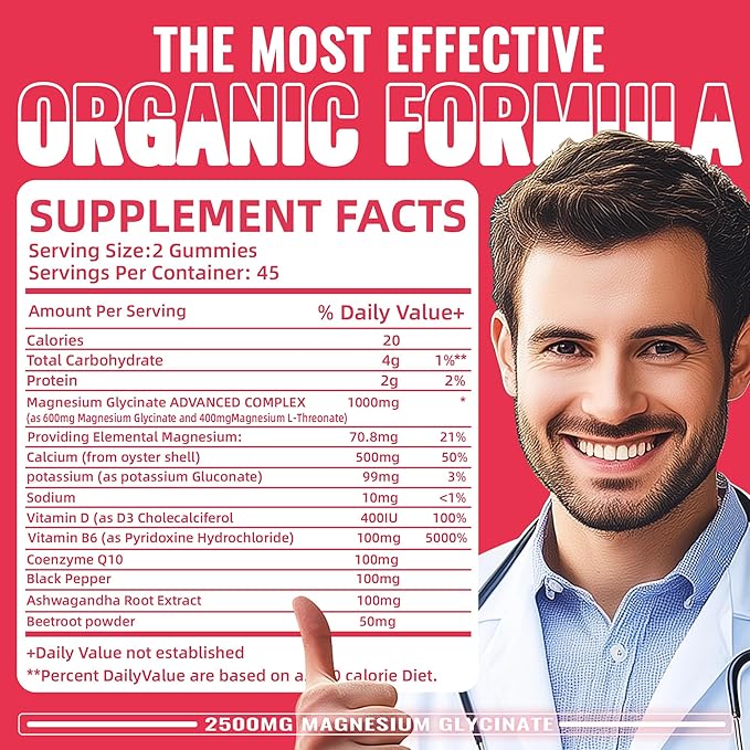 - Powerful House - Our Magnesium Gummies Contain Magnesium Glycinate 2500mg, , Vitamins D, B6, Calcium, Potassium, etc. Added Vitamin B6 help magnesium work better, Coenzyme Q10 and potassium help support the mind system and improve Memory and inattention, Vitamin D promotes the absorption of calcium